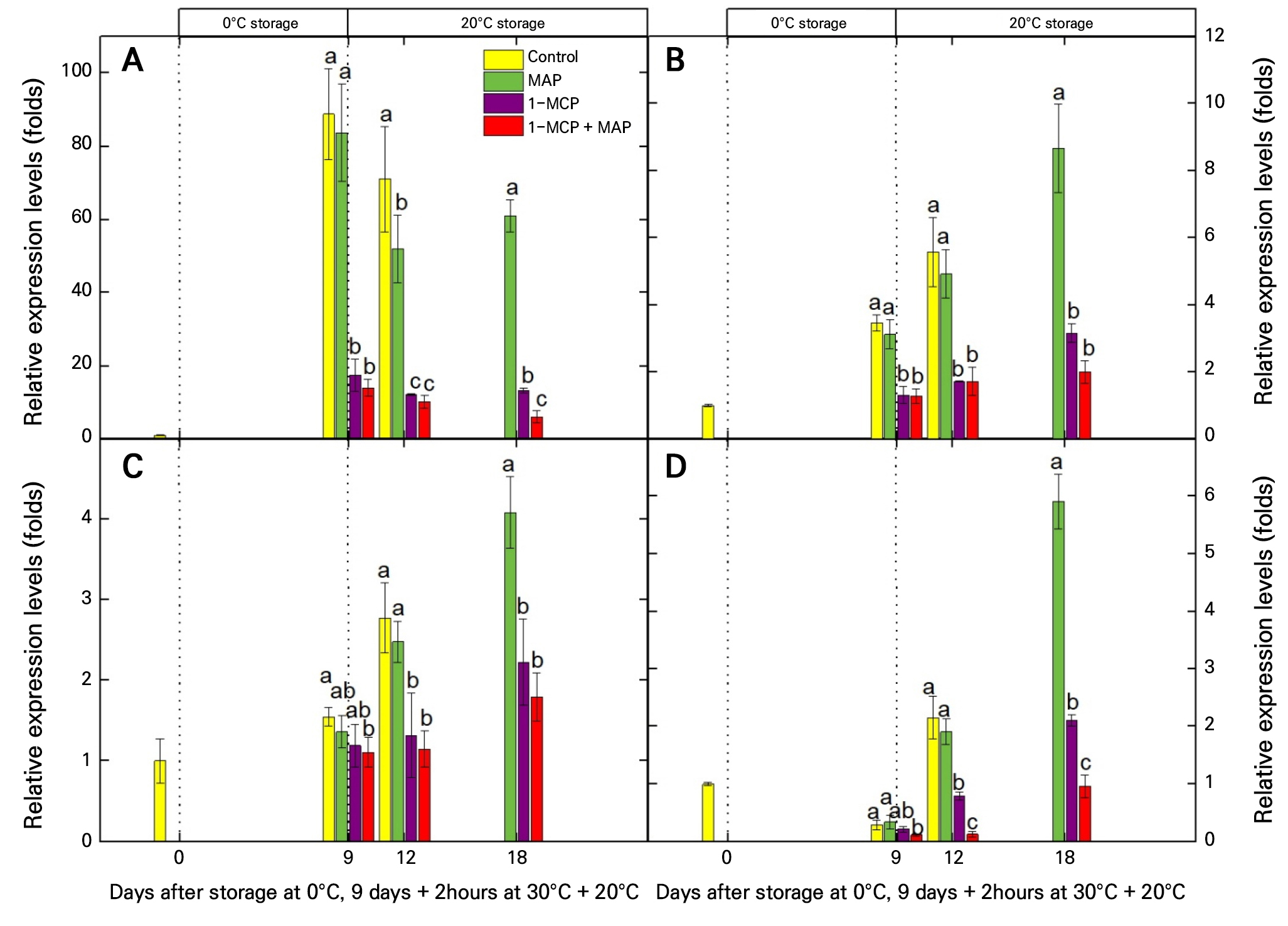 - In this study, we applied modified atmosphere packaging (MAP) and 1-methylcyclopropene (1-MCP) to postharvest ‘Gampung’ persimmons to maintain their quality and extend their distribution period during domestic distribution and export, aiming to develop better postharvest management techniques. The experiment included four groups: a no treatment group (Control) and treatment groups entitled MAP, 1-MCP, and 1-MCP + MAP. Simulated distribution conditions were based on the persimmon export process to Vietnam and consisted of nine days at 0°C (cold storage), two hours at 30°C, and 15 days at 20°C (room temperature storage), for a total of 24 days. Quality changes were evaluated after cold storage (before and after transport) and at three day intervals during room temperature storage. As a result, two MAP treatments (MAP and 1-MCP + MAP) showed prominent effects in reducing weight loss, with the 1-MCP + MAP treatment demonstrating the most significant effect. During the storage period, the expression levels of ethylene biosynthesis genes and genes related to cell wall modification were effectively suppressed in both 1-MCP-treated groups (1-MCP and 1-MCP + MAP). Notably, the 1-MCP + MAP treatment exhibited excellent ethylene production and fruit-softening inhibition effects. Overall, the 1-MCP + MAP treatment effectively suppressed weight loss and maintained fruit quality during the simulated export distribution process.