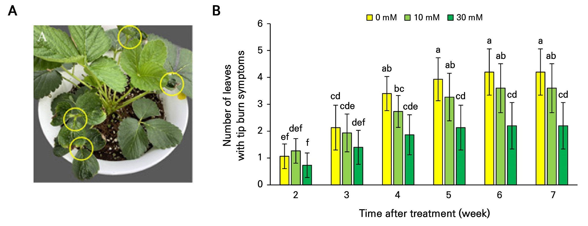 - The hot and humid conditions during the summer in South Korea can hinder growth, and diseases become a factor as well with regard to reduced fruit productivity and lower quality of ever-bearing strawberry plants. This study explores trehalose, a non-reducing disaccharide known for its regulatory roles in plant stress responses, as an eco-friendly treatment to improve strawberry productivity under high-temperature conditions. Ever-bearing strawberries were irrigated with trehalose solutions at 0, 10, and 30 mM concentrations weekly for seven weeks. The results showed no significant differences in growth, fruit quality, or photosynthetic efficiency. However, trehalose affected soil conditions, with the soil electrical conductivity (EC) decreasing as the concentration of treated trehalose increased. By the fourth week, EC in the 30 mM treatment group was lower (0.94 dS·m-1) than in the control (1.56 dS·m-1). This trend suggests that trehalose improves the soil. Additionally, the trehalose treatment reduced leaf tip burn symptoms in a concentration-dependent manner. By week six, the 30 mM treatment group displayed fewer affected leaves (2.2 per plant) than the control group (4.2 leaves), showing nearly a 50% reduction. The findings here indicate that trehalose can improve the soil EC and mitigate leaf tip burn symptoms, enhancing plant resilience. This suggests the potential of trehalose as a sustainable treatment for managing stress during strawberry cultivation, warranting further explorations into broader agricultural applications of this disaccharide.