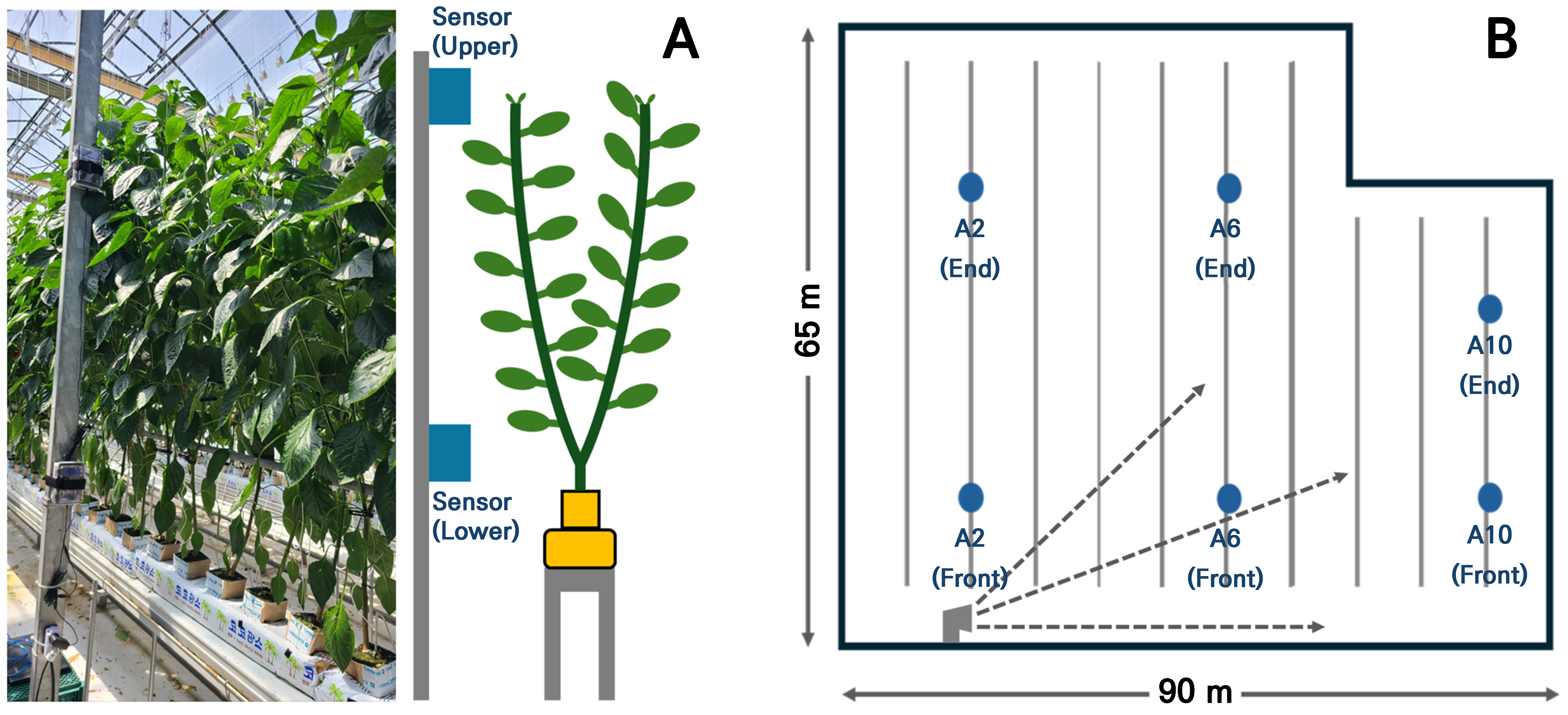 - This study was conducted in a 5,200 m2 plastic multi-span greenhouse to establish an efficient carbon dioxide (CO2) supply strategy by analyzing the distribution of CO2 concentrations according to greenhouse spatial positions and evaluating the effects of CO2 concentration variations on growth rate and yield of paprika. The experiment was carried out from February 21 to July 30, 2024, and supplemental CO2 was not separately supplied during the experiment in order to analyze the spatiotemporal distribution patterns of CO2 within the greenhouse environment. CO2 concentrations were continuously measured at upper and lower positions of the plant canopy using Arduino-based CM1107 sensors. Spatially, the greenhouse was divided into front and rear sections, as well as horizontally into left, central, and right positions. Plant growth parameters, including plant height, stem diameter, number of leaves, number of nodes, leaf area, and fresh weight, were measured weekly and statistically analyzed. The relationship between weekly cumulative daily average CO2 concentration and crop growth rate was evaluated using nonlinear regression modeling. The weekly greenhouse CO2 concentrations notably decreased immediately after sunrise during the early growth stage due to increased photosynthetic activity, while nighttime CO2 levels gradually increased throughout the growth period due to biomass accumulation and associated respiratory CO2 release. Among the positions within the greenhouse, the cumulative daily average CO2 concentration was highest at position A2F, recording 71,478.14 µmol·mol-1, which corresponded to higher fresh weight and leaf area values of 1,015.77 g and 14,416.08 cm2, respectively. The relationship between weekly cumulative daily average CO2 concentration and crop growth rate was best described by a Gaussian peak model (R2 = 0.58). The findings regarding the spatiotemporal distribution of CO2 concentrations within the greenhouse and the resulting crop growth and productivity from this study could serve as fundamental data useful for establishing greenhouse environmental management strategies. - COLLAPSE