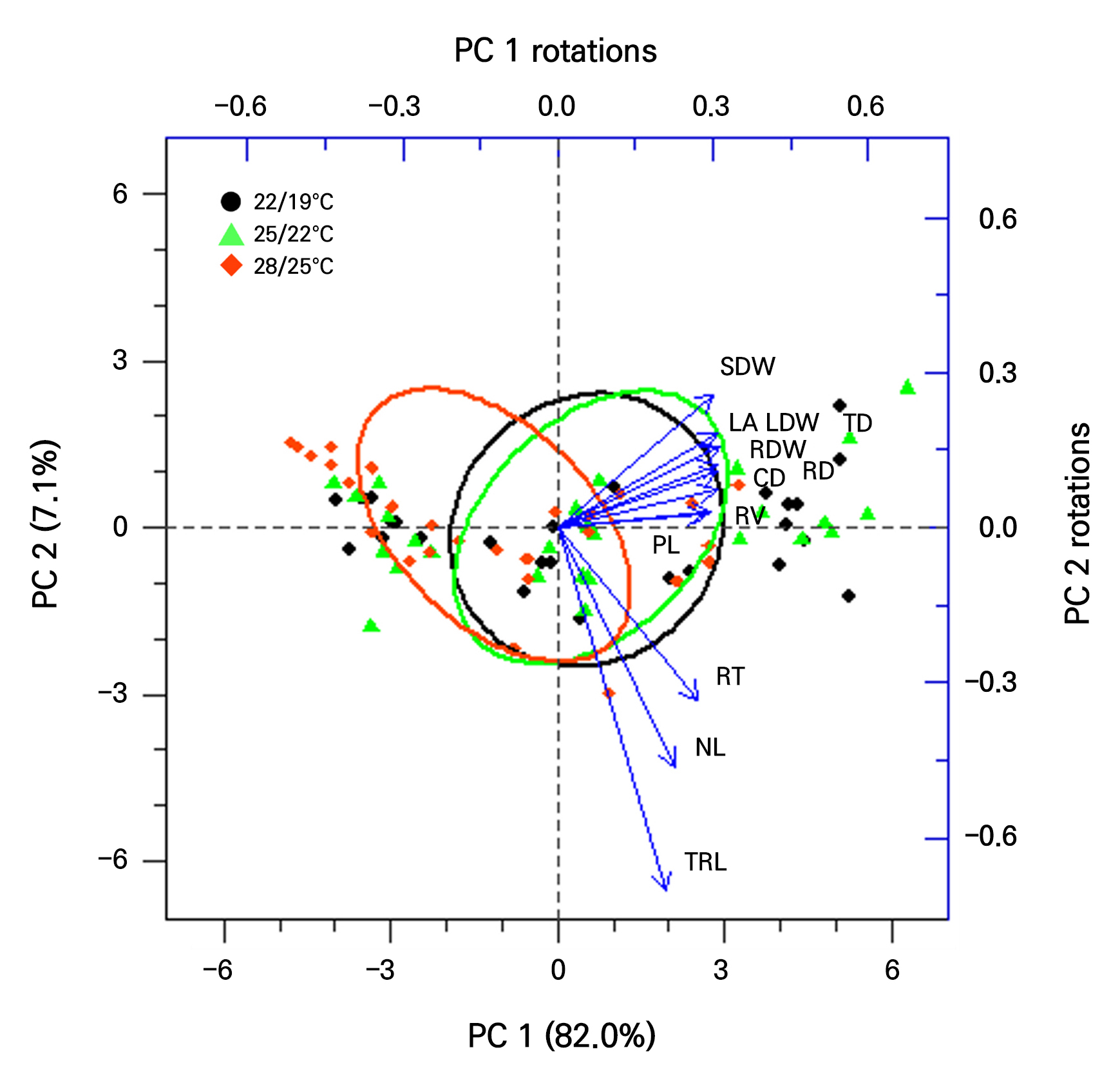 - In this study, we aimed to evaluate the growth characteristics of Korean angelica (Angelica gigas Nakai) seedlings grown under different temperatures in plant factories with artificial lighting systems (PFALs). The temperatures in the PFALs were maintained at 22/19°C (light/dark), 25/22°C, and 28/25°C, with an alternating 12-hour photoperiod used in each case. Light-emitting diodes (red : green : blue = 7 : 1 : 2) were used as the light sources. Before sowing, Korean angelica seeds underwent two weeks of a cold treatment to break their morphophysiological dormancy. Seeds were sown in 72-cell plug trays, and the resultant seedlings were grown for 60 days to evaluate their growth and development. Additionally, principal component analysis (PCA) was employed to examine the relationships between shoot and root development. It was found that the shoot growth parameters of the crown diameter, leaf area, and leaf dry weight increased at 22/19°C and 25/22°C compared to 28/25°C. Seedlings grown at 22/19°C showed a larger root volume and a significantly higher root : shoot ratio, which was more effective for root development. The net photosynthesis rate tended to increase with a decrease in the temperature. The PCA results confirmed a strong correlation among the petiole length, crown and root diameters, leaf area, leaf and root dry weights, and root volume. These results indicate that Korean angelica seedlings exhibit enhanced root development and net photosynthesis at relatively low temperatures in PFALs. - COLLAPSE