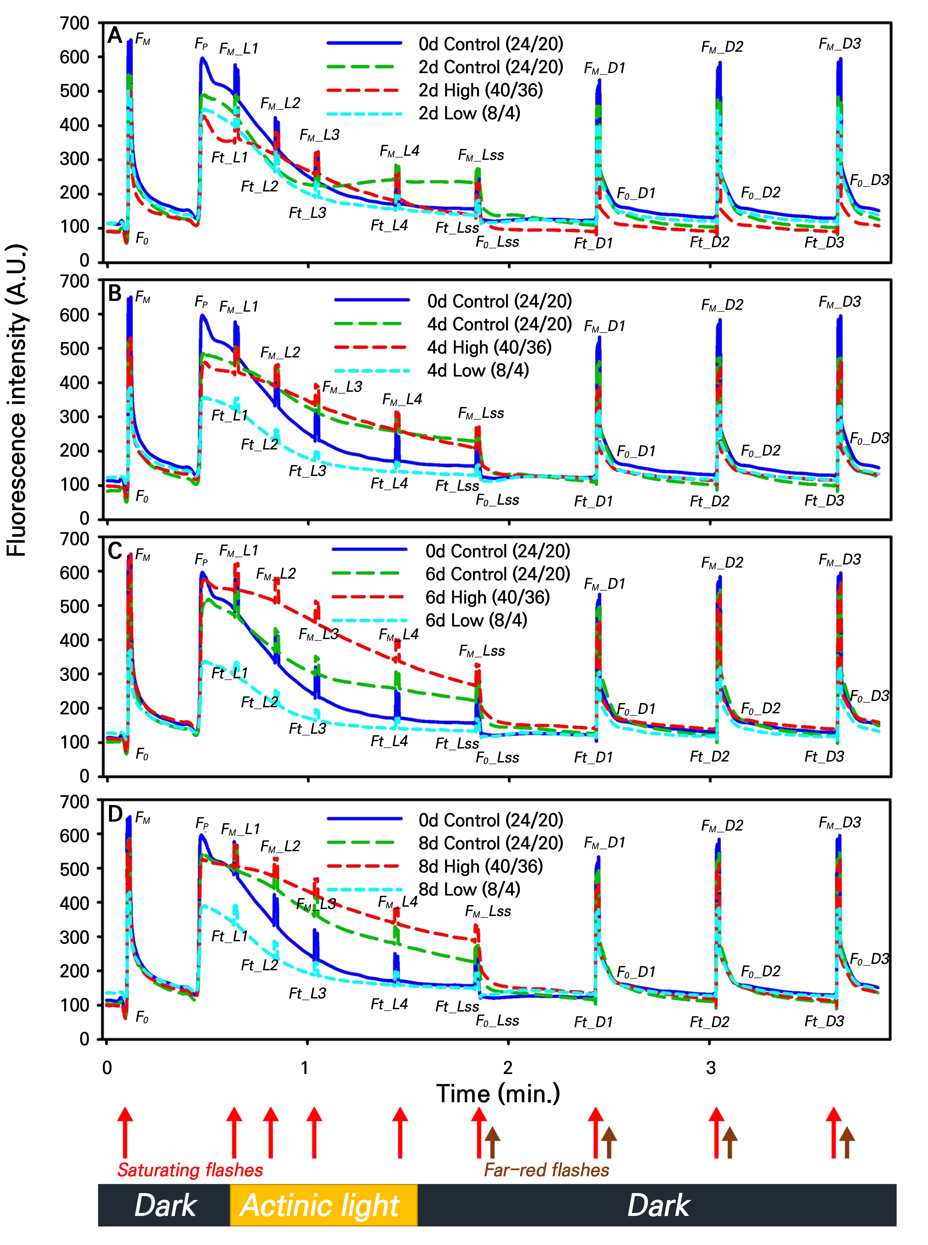 - This study sought to monitor changes in growth parameters, chlorophyll fluorescence (CF) levels, and proline and chlorophyll contents in lettuce seedlings grown under different temperature conditions. Ten-day-old lettuce seedlings grown under a fluorescent lamp in a closed plant production system having a constant temperature (24/18°C), humidity of 60 ± 3%, and a light period of 14/10 h (day/night) were kept at 24/18°C for three days in a closed chamber under white warm LED lighting at 220 ± 10 µmol∙m-2∙s-1. The seedlings were then grown under different temperature conditions [low: 8/4°C (day/night), control: 24/20°C, and high: 40/36°C] in a closed and controlled plant production system for eight days. The CF parameters, proline amount, and chlorophyll content were measured at 0, 2, 4, 6, and 8 d after the initiation of the treatment, while the growth parameters (fresh weight, dry weight, leaf length, and hypocotyl length) were measured at the end of the experiment. The quantum yield of nonregulated energy dissipation in PSII [Y(NO)] increased on the second day and then decreased at low temperatures. Non-photochemical quenching (NPQ) and the fluorescence decrease ratio (Rfd) significantly decreased under both high- and low-temperature stress compared to those in the control. Growth parameters were retarded at low temperatures, whereas leaves became dry at high temperatures. The chlorophyll content decreased significantly, whereas the proline content increased only at low temperatures. These results indicate that Y(NO), NPQ, and Rfd can be used to detect temperature stress in lettuce seedlings. - COLLAPSE
