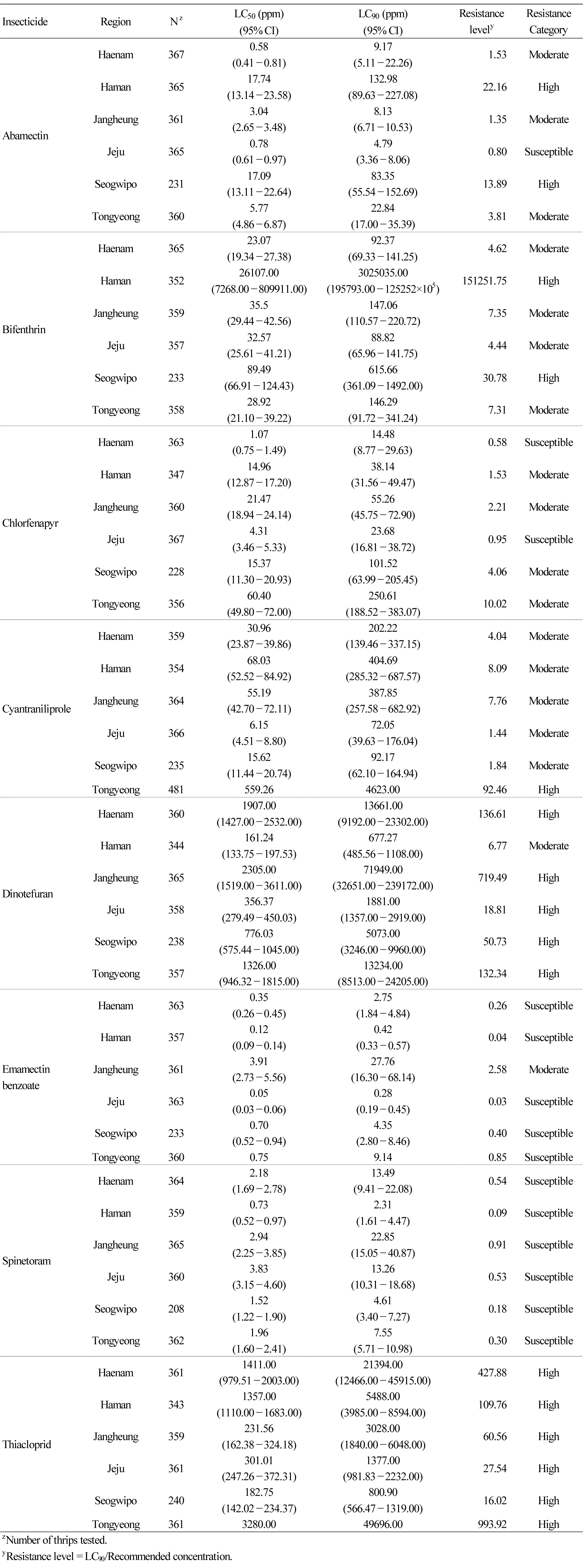 - Chilli thrips (Scirtothrips dorsalis) is a type of serious pest causing a significant damage during mango cultivation in Korea. Control is mainly achieved through the intense application of insecticides, a practice that facilitates the development of insecticide resistance worldwide. We evaluated the resistance of chilli thrips collected from mango cultivation areas in Korea to eight registered insecticides: abamectin 1.8% EC, bifenthrin 2% WP, chlorfenapyr 5% EC, cyantraniliprole 10% SE, dinotefuran 20% WG, emamectin benzoate 2.15% EC, spinetoram 5% SC, and thiacloprid 10% SC. Bifenthrin encountered relatively high resistance, requiring over 4 times the recommended concentration (RC) to produce 90% mortality, in all regions, and high levels of resistance to dinotefuran and thiacloprid were observed in all regions. On the other hand, spinetoram encountered low resistance levels in all regions. Emamectin benzoate was also highly effective, producing LC90 values below the RC in all regions except Jangheung. Chlorphenapyr encountered low resistance levels in Jeju-si and Haenam-gun, but high resistance was recorded in Tongyeong-si. Cyanthraniliprole faced moderate to high resistance in all regions. These findings suggest that there is a need to establish an effective control system for chilli thrips, which would require the continuous monitoring of regional insecticide resistance. - COLLAPSE